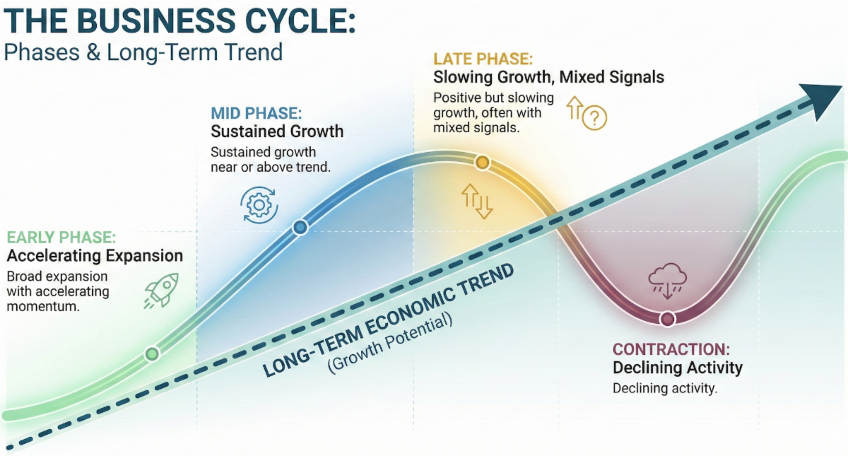 Australia is in a classic mid-cycle spot. The economy is growing and forward-looking signals lean constructive, but momentum isn't screaming "boom."