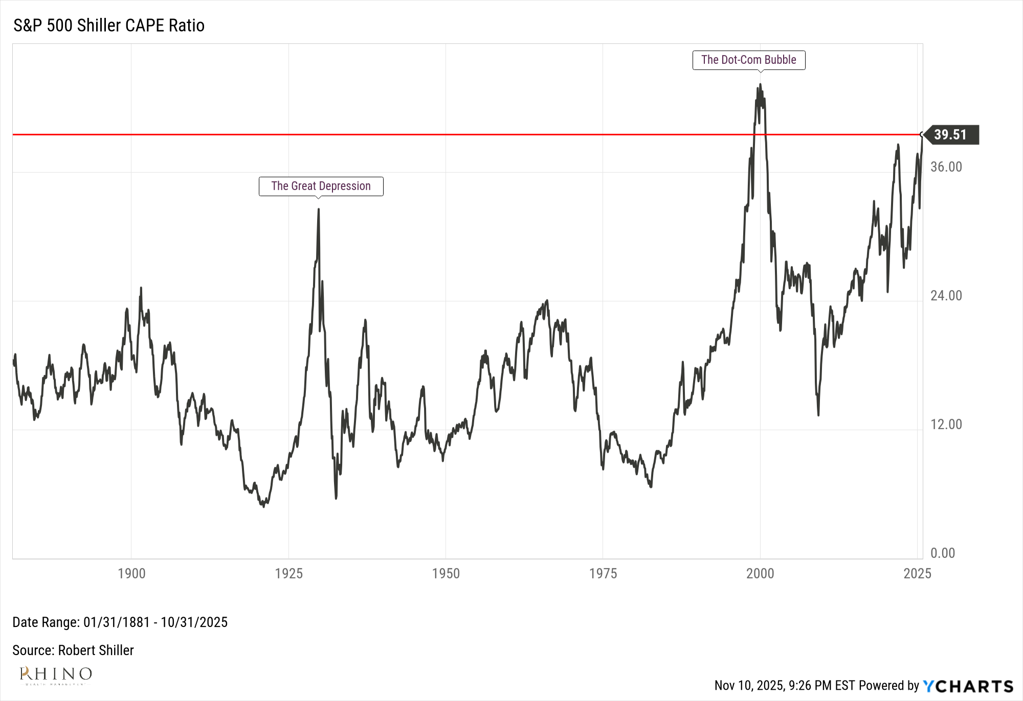 As of the end of October, the S&P 500 was trading at a Shiller CAPE ratio of 39.51, and has continued higher—the second-highest reading in 150 years of market history.1 Only the dot-com bubble peak exceeded this level. We're not in expensive territory. We're in bubble territory.